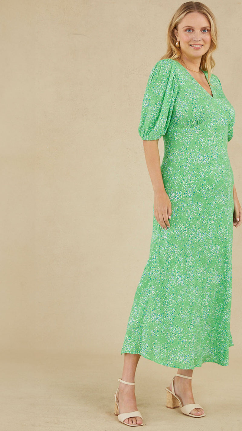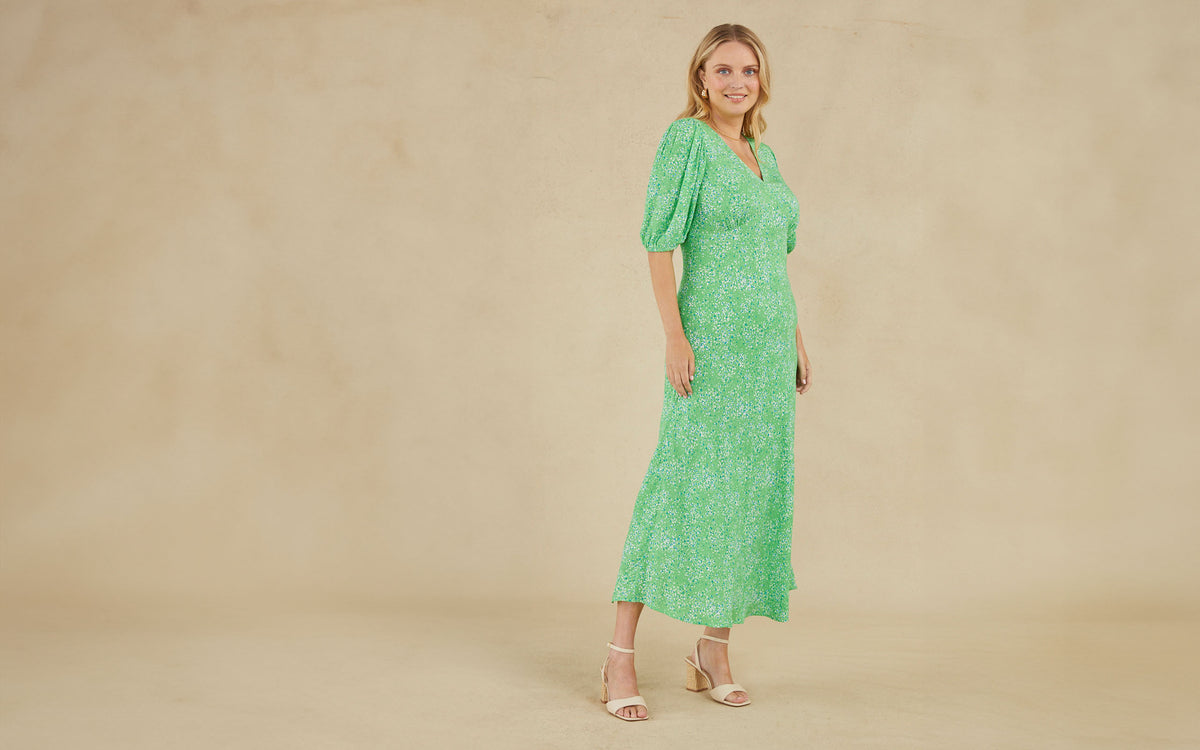 The perfect go-to for warm, hazy days, the green smudge leopard print dress looks great with neutral accessories. It features a chic V-neck and delicate puff sleeves. Shirred fabric at the back has been added to give more room for comfort.